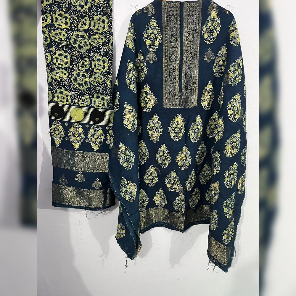 This is an unstitched dola silk with ajrakh print suit fabric. You can customise it according to your size.